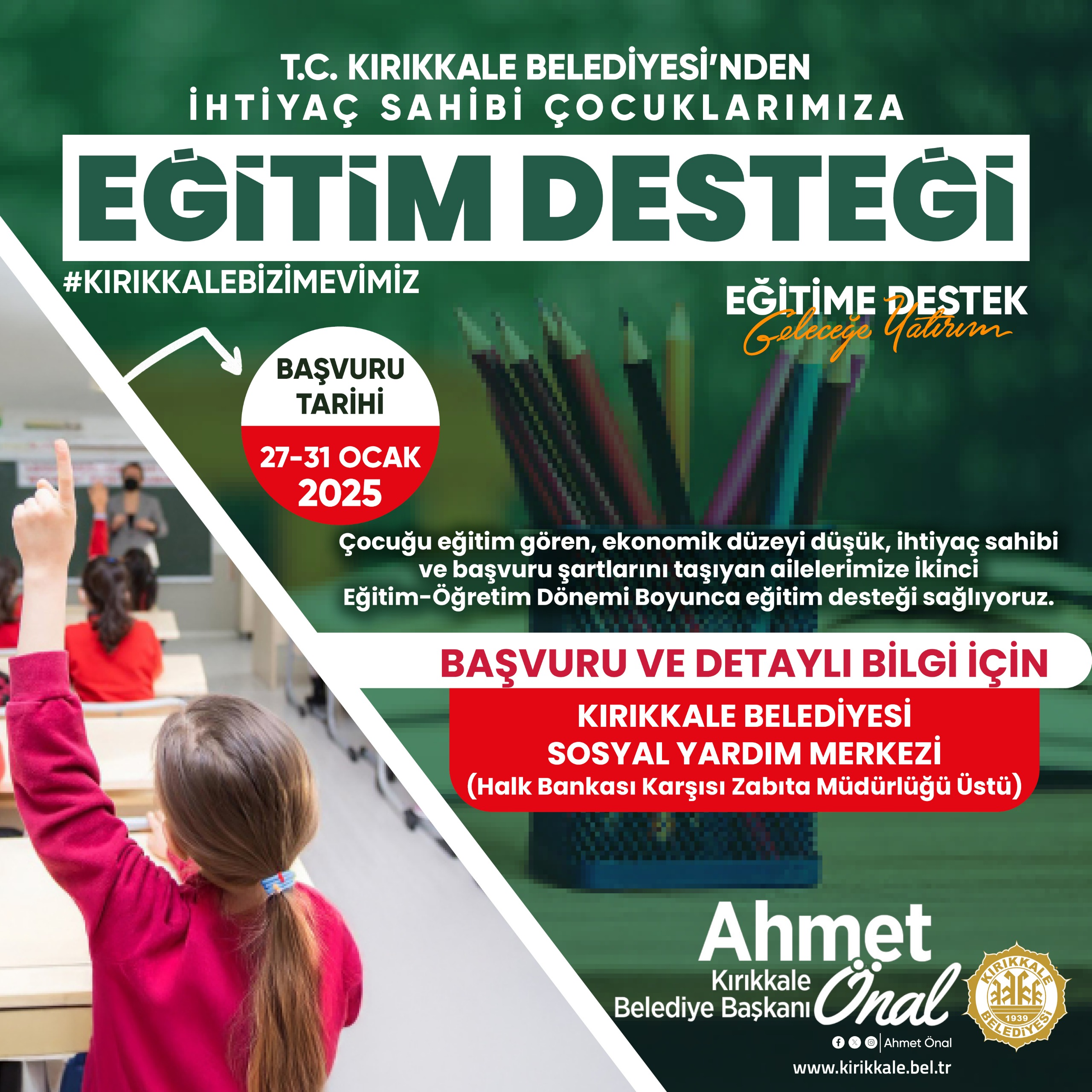 Başkan Ahmet Önal’ın liderliğinde yürütülen projeye ilişkin yapılan açıklamada, eğitimin her çocuğun hakkı olduğu vurgulanırken, tüm Kırıkkale halkı dayanışmaya davet edildi. Destekten faydalanmak isteyen aileler, 27-31 Ocak tarihleri arasında Kırıkkale Belediyesi Sosyal Yardım Merkezi’ne başvurabilecek.
