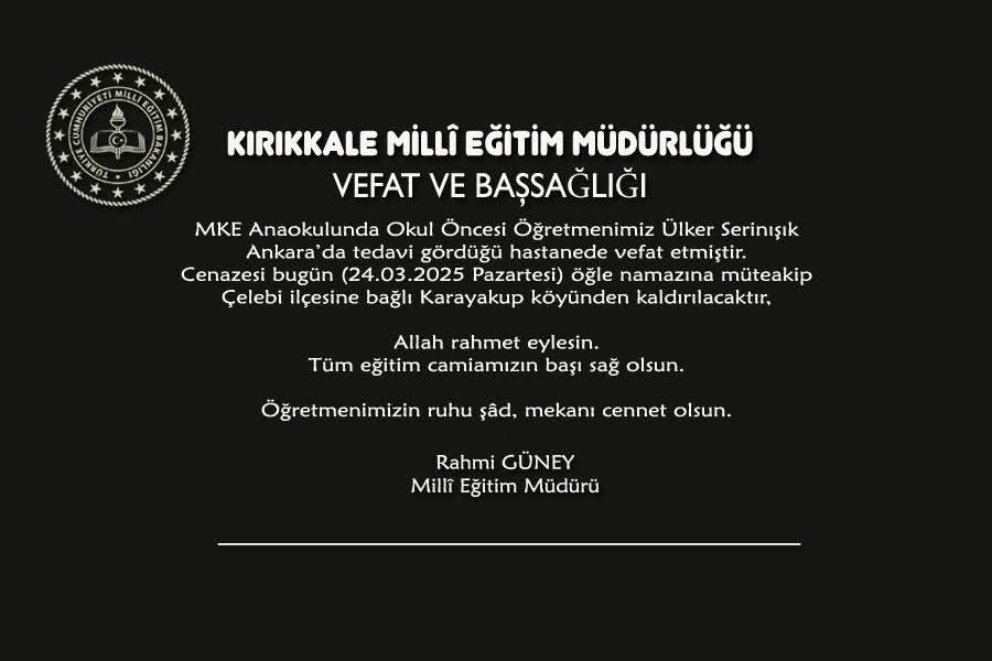 Bizlerde Kırıkkale Son Haber ve Gündem 71 ailesi olarak, merhume Serinışık’a Allah’tan rahmet, ailesi ve yakınlarına başsağlığı dileriz.